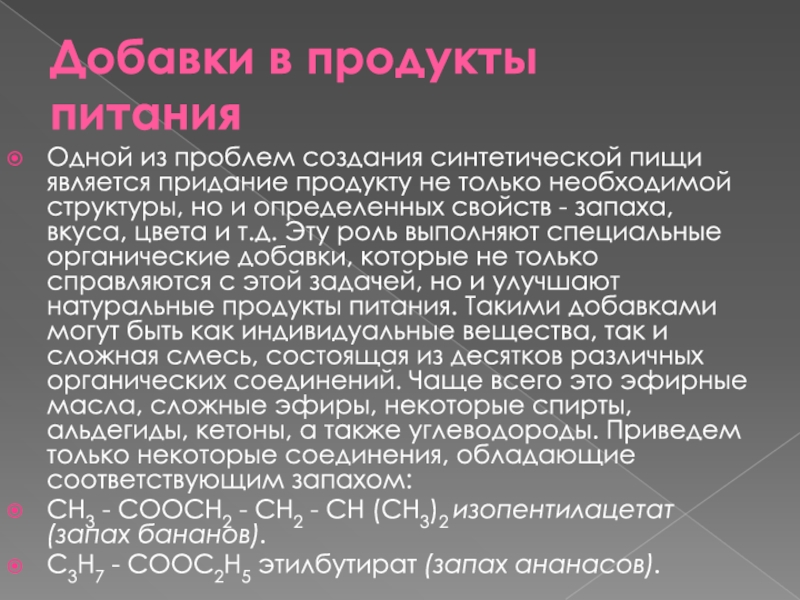 Наверное, вы слышали, что во многие пищевые продукты добавляют различные химические вещества. Одни из них придают пище более привлекательный вид, другие - приятный запах, третьи - вкус. Но они могут выполнять и более важную роль - сохранять долго продукты, препятствовать их окислению. Большинство из этих веществ - органические соединения.