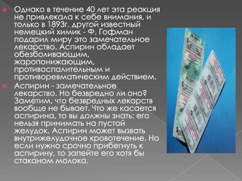 - Ф. Гофман подарил миру это замечательное лекарство. Аспирин обладает обезболивающим, жаропонижающим, противоспалительным и противоревматическим действием.
