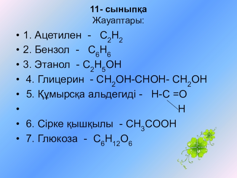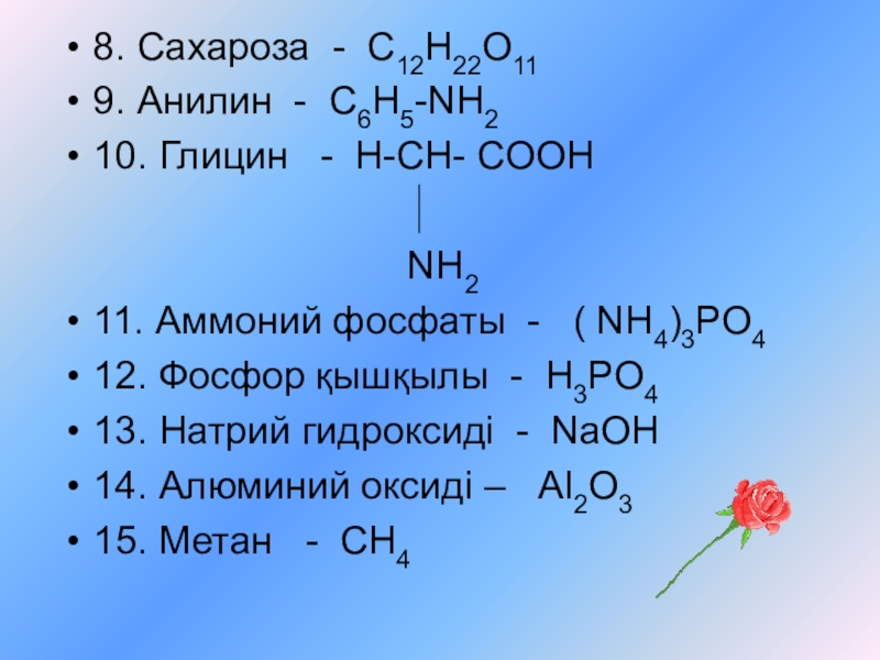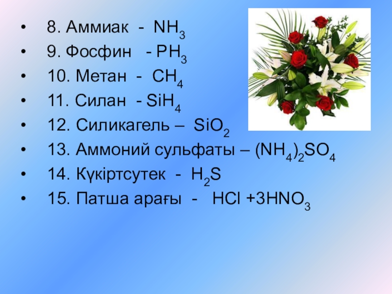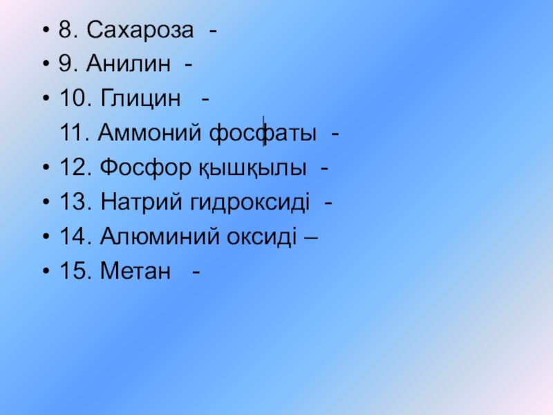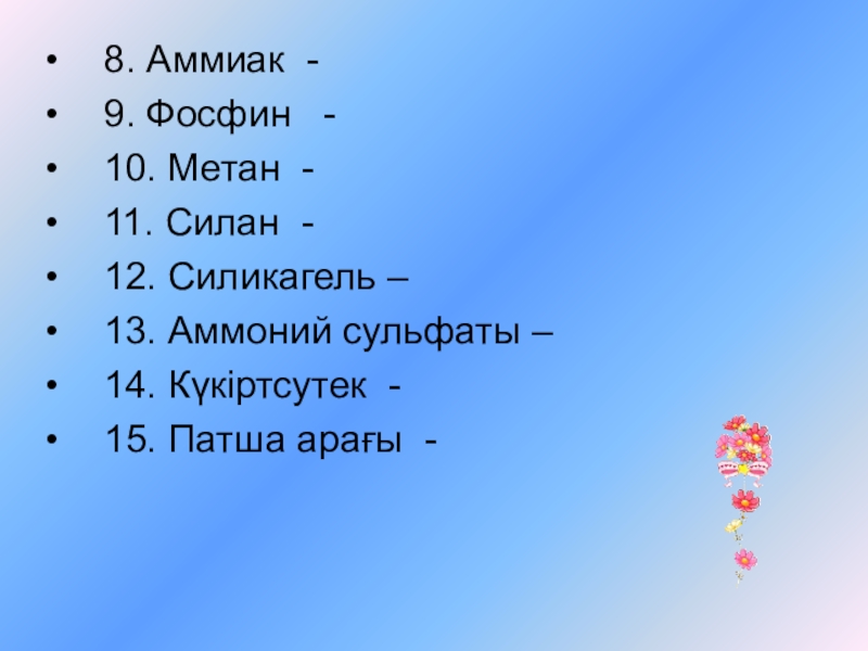 6.Өзі химиялық элемент, егер «ан» қосымшасын жалғасаң қыстың қаһарлы күндерін есіңе түсіреді.Бұл қай элемент?