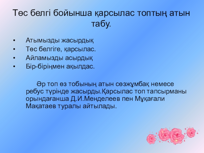 өз тобының атын сөзжұмбақ немесе ребус түрінде жасырды.Қарсылас топ тапсырманы орындағанша Д.И.Менделеев пен Мұқағали Мақатаев туралы айтылады.