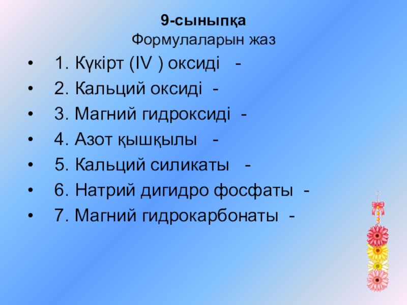 Интерактивті тақтадан оқушыларға оқу бағдарламасына сәйкес заттардың формулаларын жазу тапсырмасы берілді.