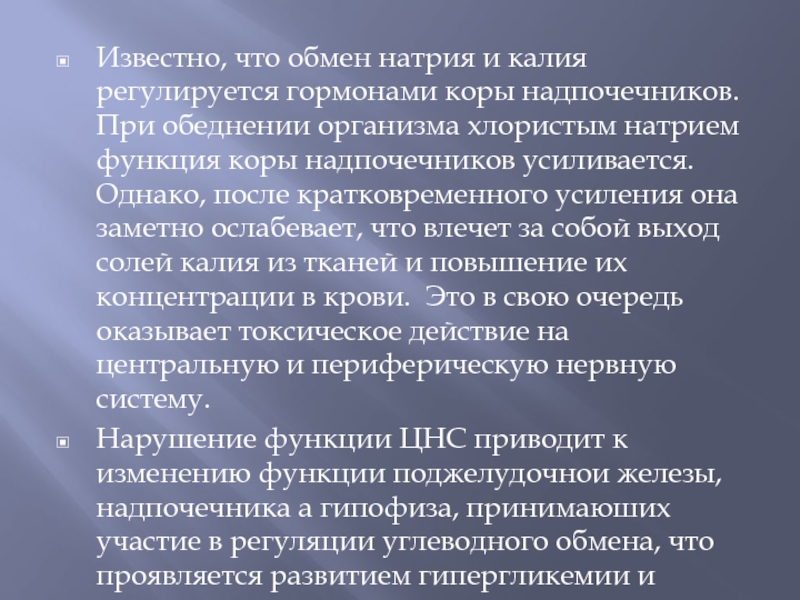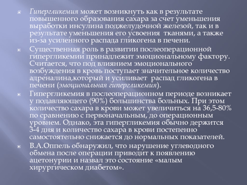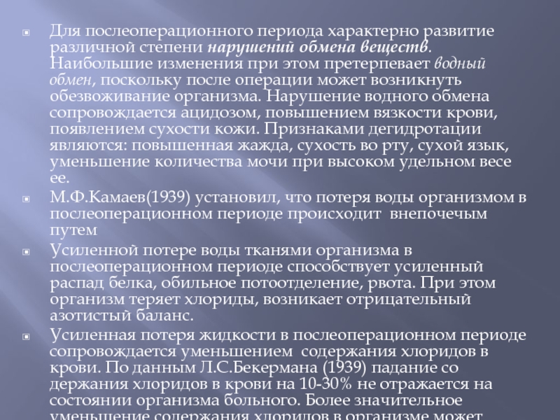 объема оперативного вмешательства, а также от состояния нервно-психического статуса больного. Психическая травма, вызываемая операцией, и испытываемые больным боли проводят к нарушению обмена веществ в организме больного, развитию послеоперационного ацидоза, нарушению функции органов выделения.