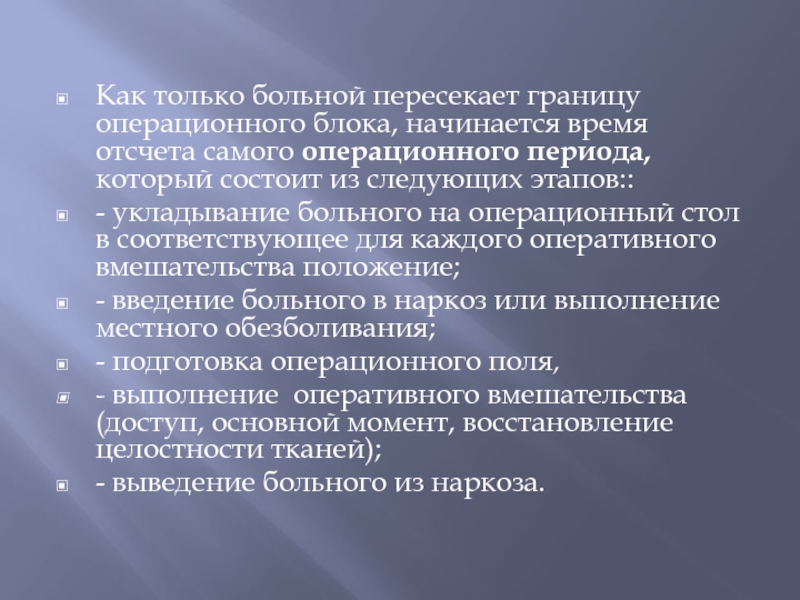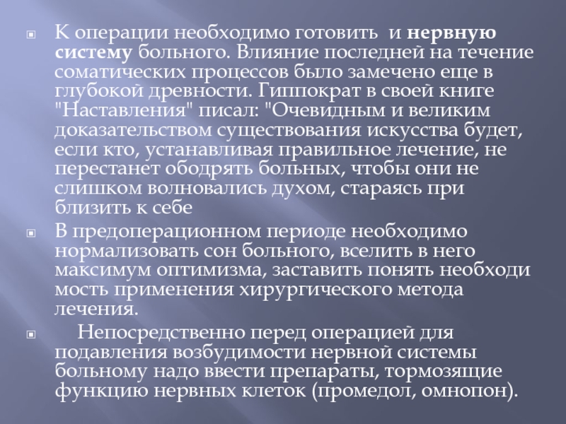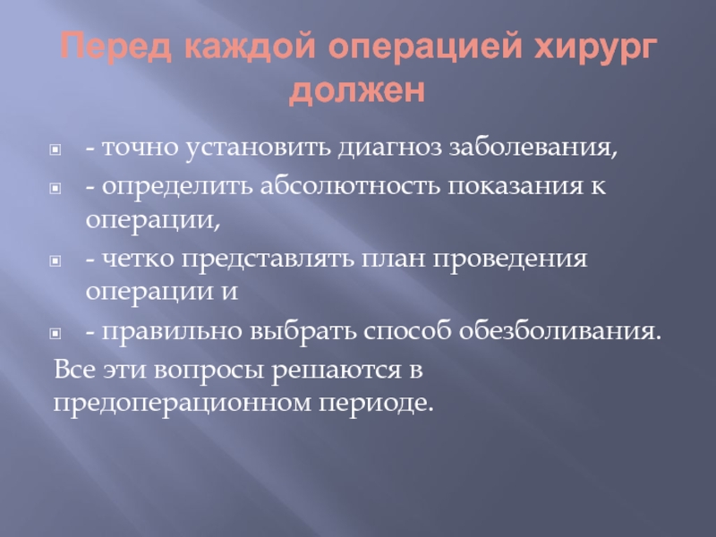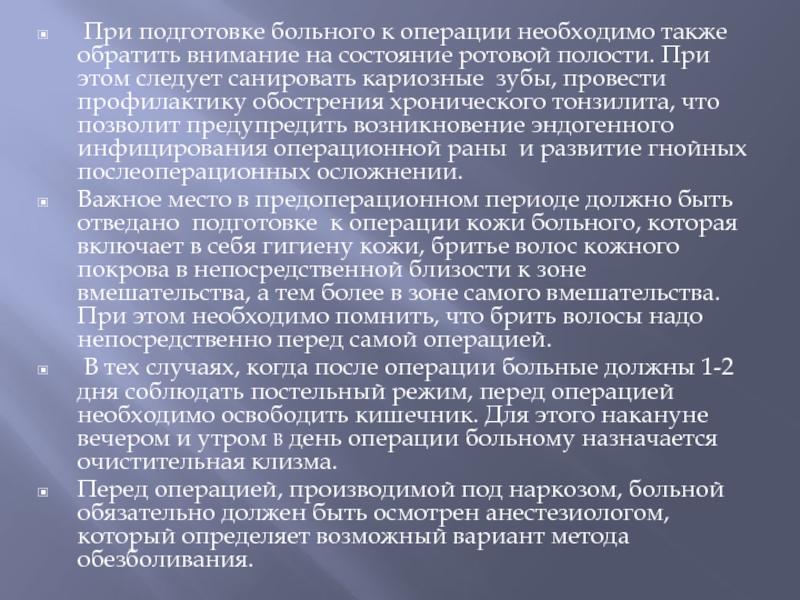 Максимальному уменьшению опасности операции способствует правильно проведенный предоперационный период