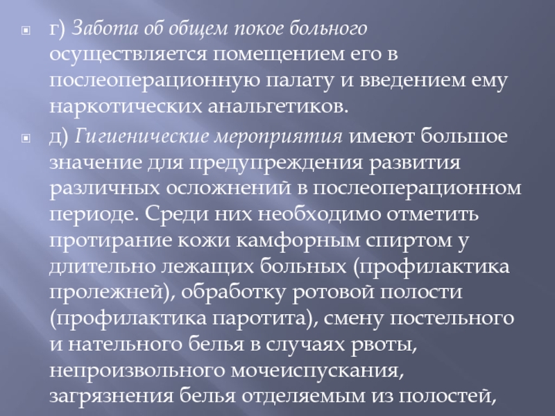 Слайд 40г) Забота об общем покое больного осуществляется помещением его в