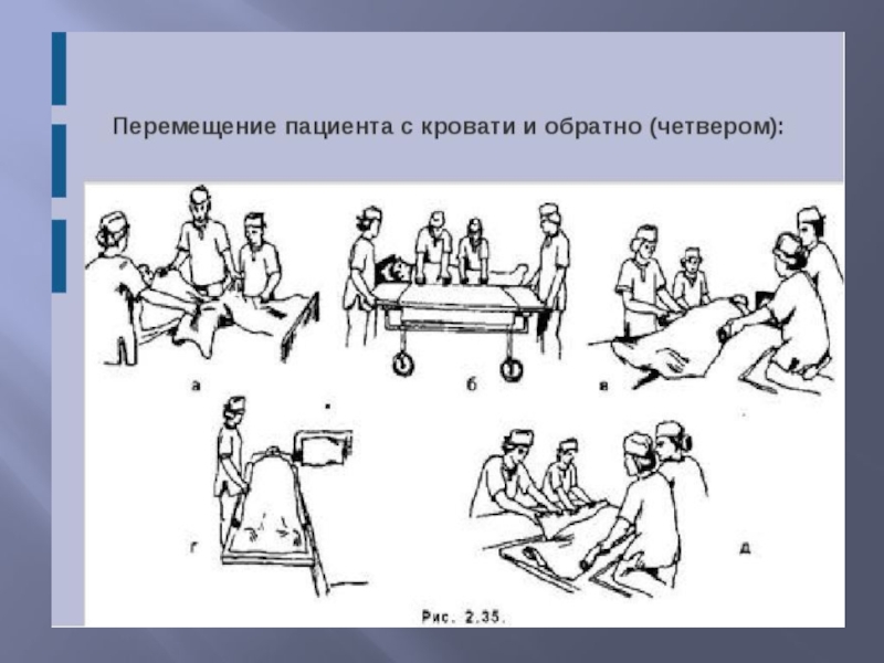 а) Транспортировака больного из операционной в палату производится на каталке в лежачем положении. Каталка должна быть приспособлена для удобного перекладывания больного на кровать.