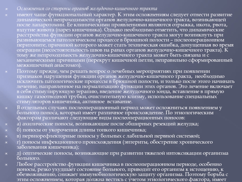 этим осложнениям следует отнести развитие динамической непроходимости органов желудочно-кишечного тракта,
