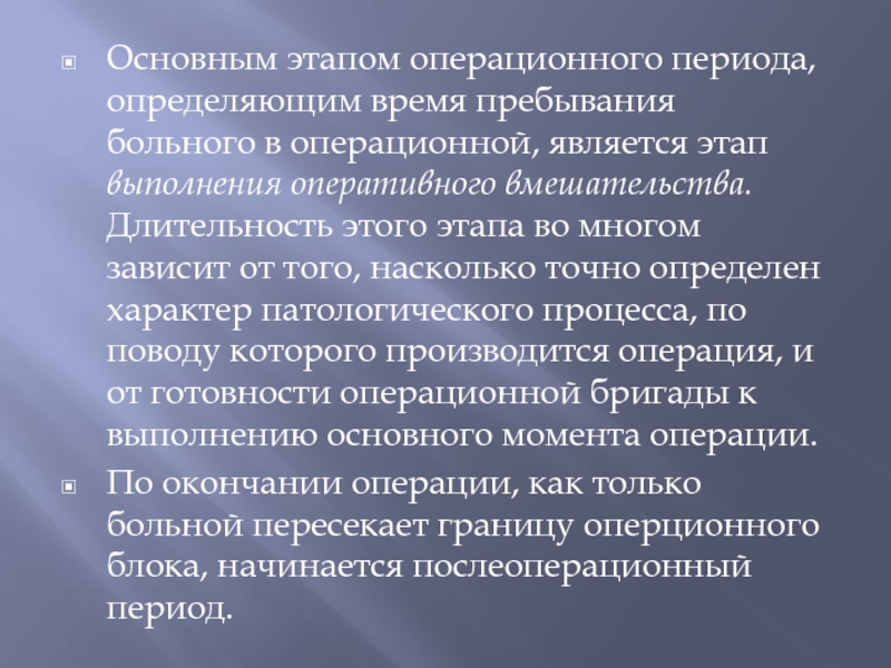 стационар до момента выполнения оперативного вмешательства. Это время бывает различным в зависимости от характера патологического процесса.