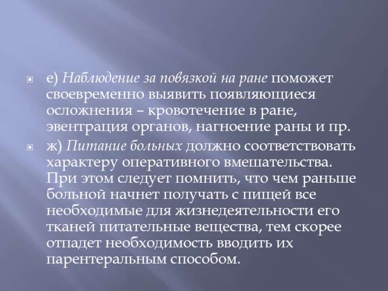 ж) Питание больных должно соответствовать характеру оперативного вмешательства. При этом следует помнить, что чем раньше больной начнет получать с пищей все необходимые для жизнедеятельности его тканей питательные вещества, тем скорее отпадет необходимость вводить их парентеральным способом.