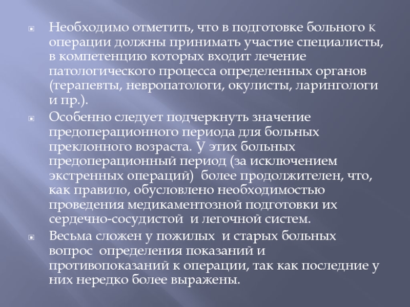 Если подвести итог сказанному, можно утверждать, что только операция, даже блестяще выполненная, не может обеспечить успех лечения без предварительной подготовки больного к операции, направленной на компенсацию нарушений функций его жизненно важных органов и учета индивидуальных особенностей больного.