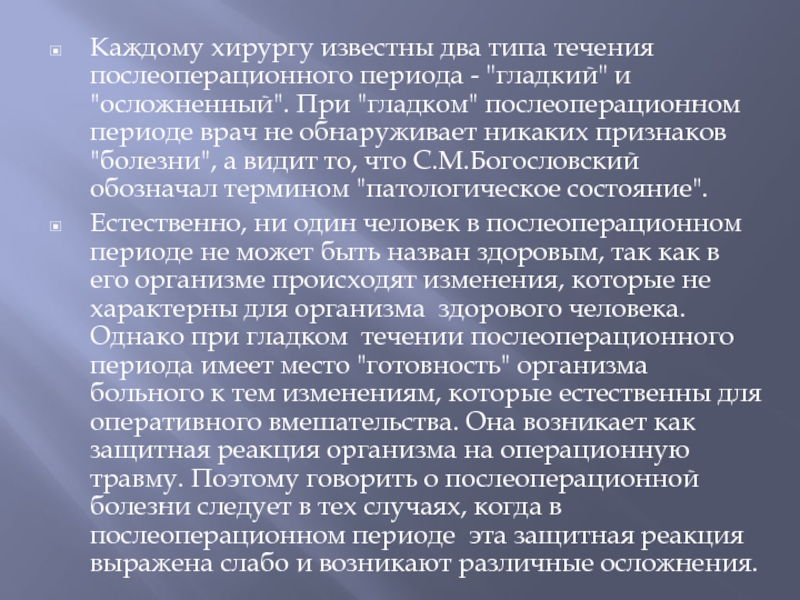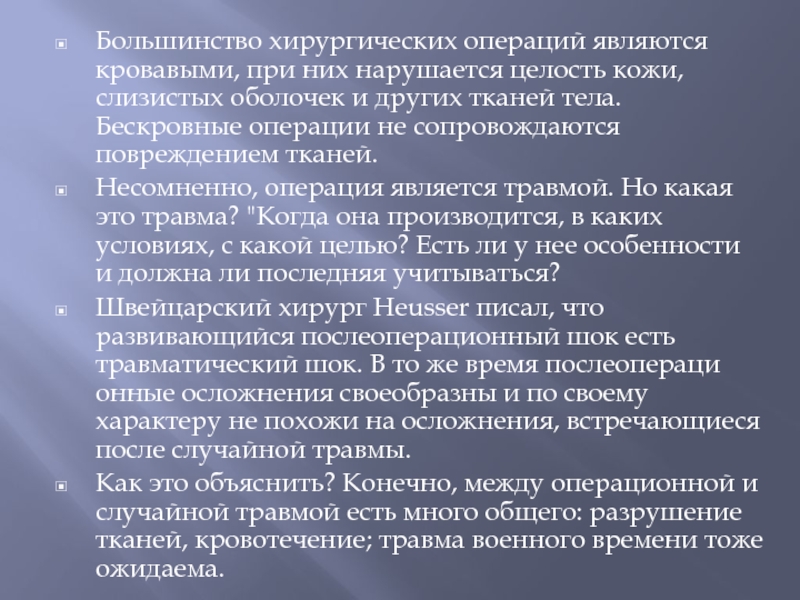 Швейцарский хирург Heusser писал, что развивающийся послеоперационный шок есть травматический шок. В то же время послеоперационные осложнения своеобразны и по своему характеру не похожи на осложнения, встречающиеся после случайной травмы.