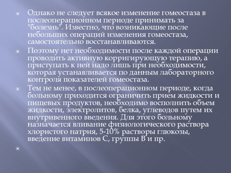 развивающихся в это время изменений гомеостаза приводят к развитию послеоперационных