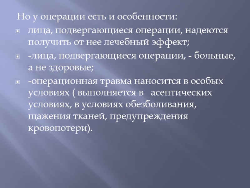 -операционная травма наносится в особых условиях ( выполняется в асептических условиях, в условиях обезболивания, щажения тканей, предупреждения кровопотери).