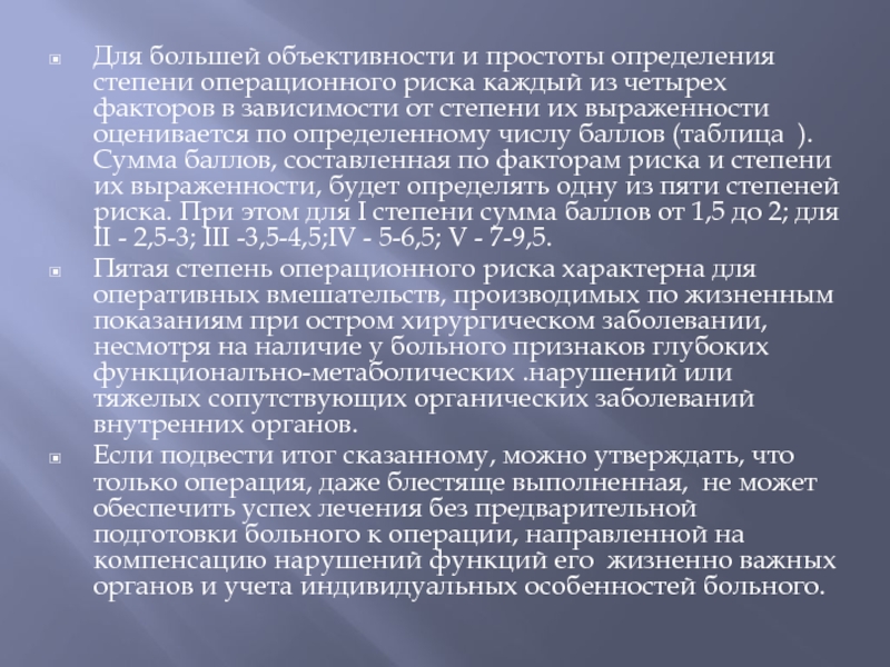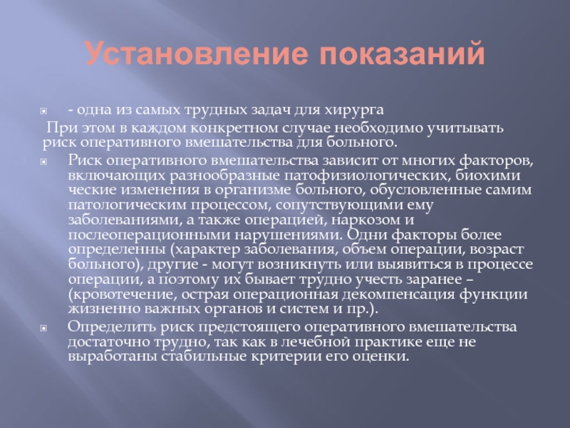 Риск оперативного вмешательства зависит от многих факторов, включающих разнообразные патофизиологических, биохимические изменения в организме больного, обусловленные самим патологическим процессом, сопутствующими ему заболеваниями, а также операцией, наркозом и послеоперационными нарушениями. Одни факторы более определенны (характер заболевания, объем операции, возраст больного), другие - могут возникнуть или выявиться в процессе операции, а поэтому их бывает трудно учесть заранее – (кровотечение, острая операционная декомпенсация функции жизненно важных органов и систем и пр.).