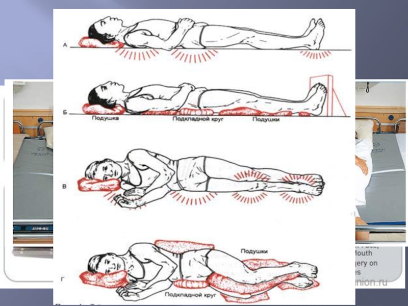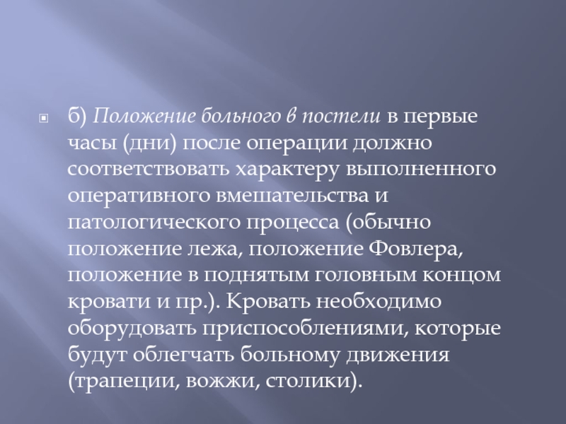 Слайд 38б) Положение больного в постели в первые часы (дни) после