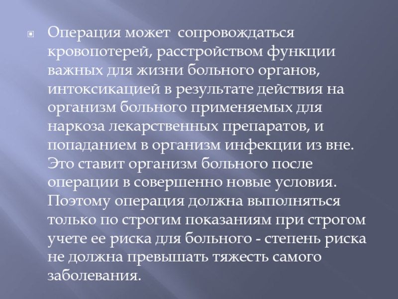наркоза лекарственных препаратов, и попаданием в организм инфекции из вне. Это ставит организм больного после операции в совершенно новые условия. Поэтому операция должна выполняться только по строгим показаниям при строгом учете ее риска для больного - степень риска не должна превышать тяжесть самого заболевания.