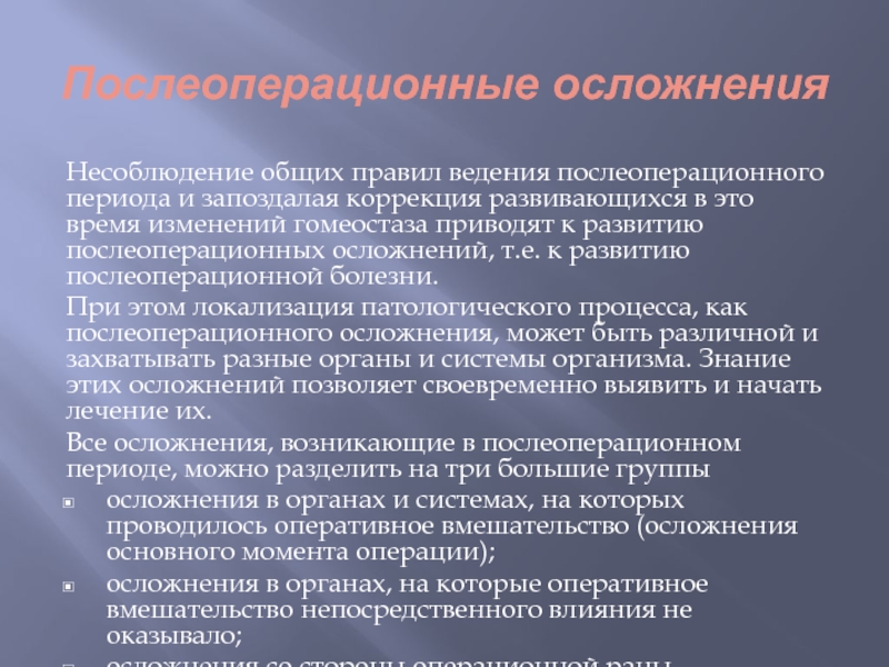 Все они оказывают влияние на течение биологических процессов в организме больного, вызывая ряд патологических состояний органов и систем человеческого тела, которые получили название послеоперационные осложнения..
