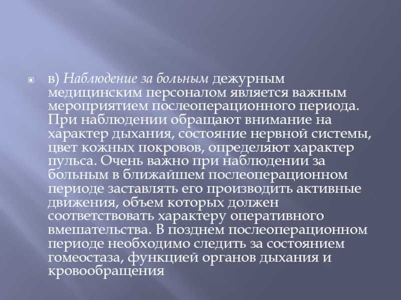 Слайд 39в) Наблюдение за больным дежурным медицинским персоналом является важным мероприятием