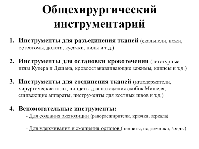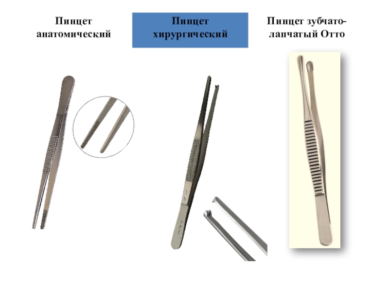 - Для удерживания и смещения органов (пинцеты, подъёмники, зонды)