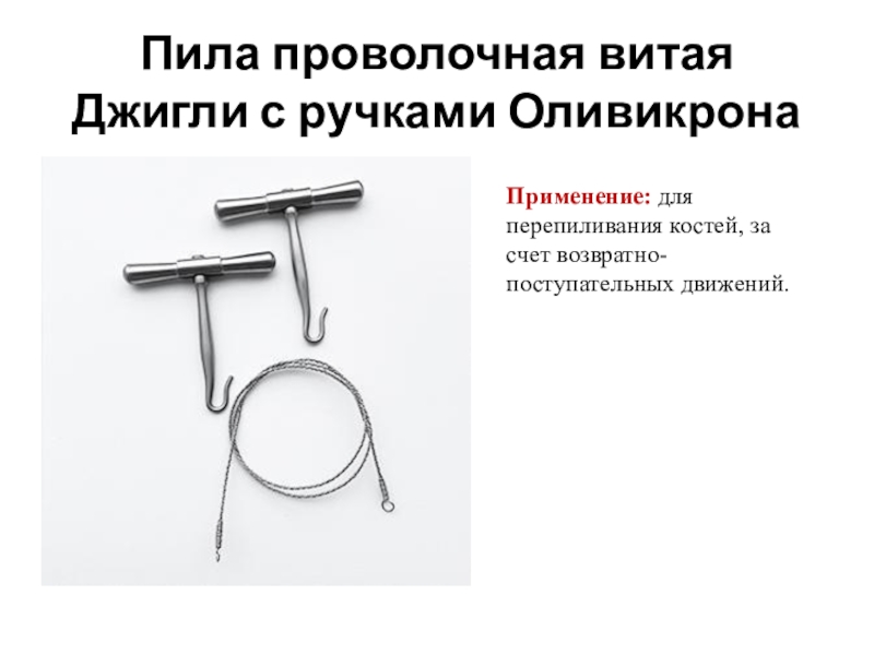 3. Инструменты для операций на костях (долота плоские и желобоватые, молоток, кусачки Люэра, щипцы для удержания костей (Фарабефа, Олье), пила рамочная, пила проволочная витая Джигли, распаратор, секвестральная ложка Фолькмана ; для ампутации конечности - ножи ампутационные, ретрактор и др).