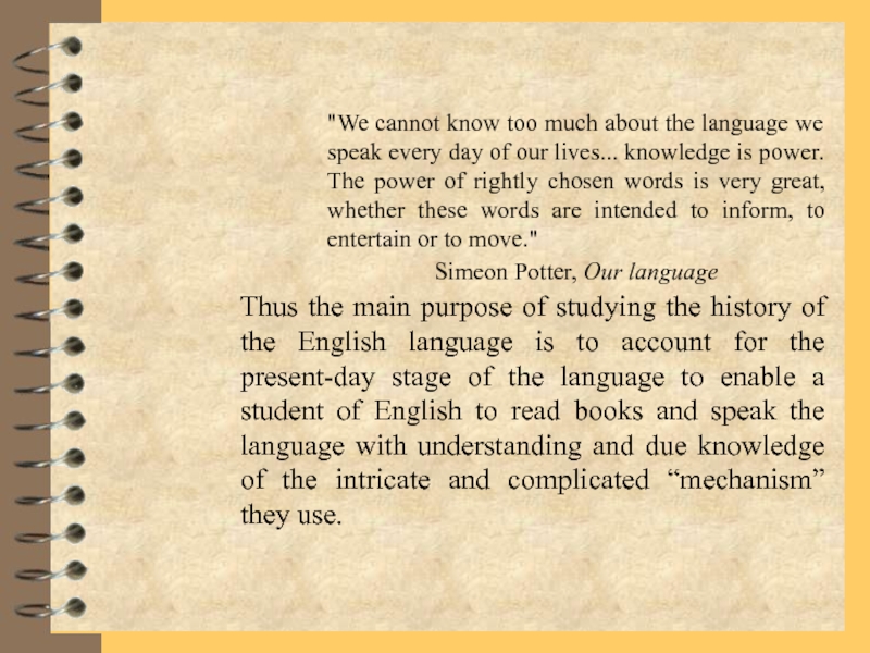Thus the main purpose of studying the history of the English language is to account for the present-day stage of the language to enable a student of English to read books and speak the language with understanding and due knowledge of the intricate and complicated “mechanism” they use.