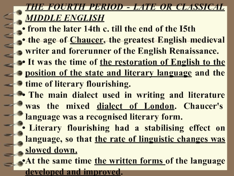 Слайд 15THE FOURTH PERIOD - LATE OR CLASSICAL MIDDLE ENGLISH