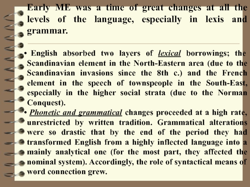Phonetic and grammatical changes proceeded at a high rate, unrestricted by written tradition. Grammatical alterations were so drastic that by the end of the period they had transformed English from a highly inflected language into a mainly analytical one (for the most part, they affected the nominal system). Accordingly, the role of syntactical means of word connection grew.