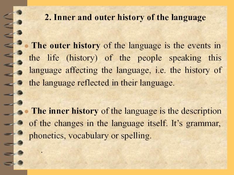 The inner history of the language is the description of the changes in the language itself. It’s grammar, phonetics, vocabulary or spelling.