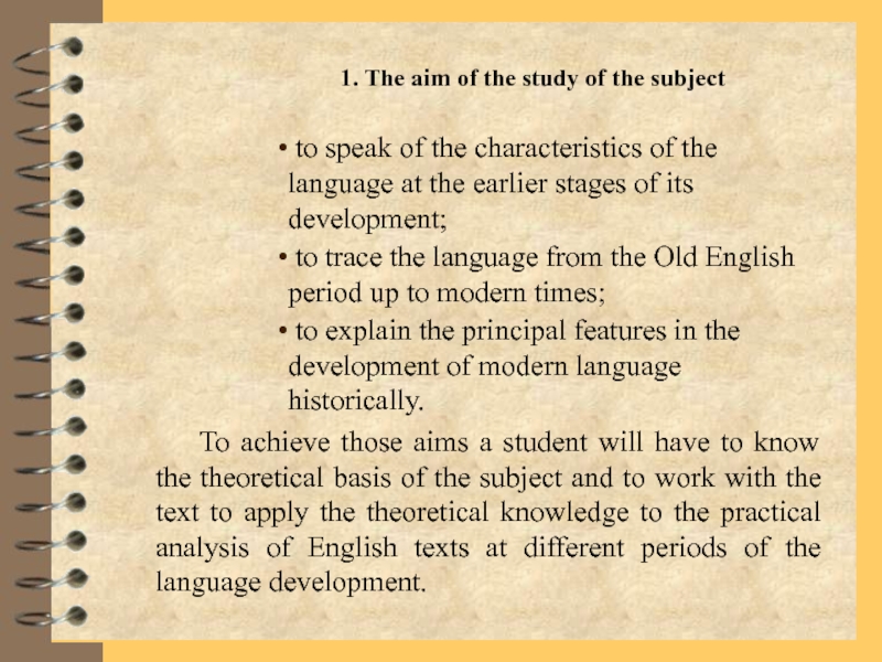 To achieve those aims a student will have to know the theoretical basis of the subject and to work with the text to apply the theoretical knowledge to the practical analysis of English texts at different periods of the language development.