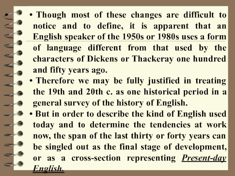 But in order to describe the kind of English used today and to determine the tendencies at work now, the span of the last thirty or forty years can be singled out as the final stage of development, or as a cross-section representing Present-day English.