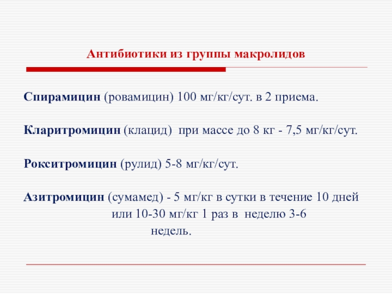Спирамицин (ровамицин) 100 мг/кг/сут. в 2 приема.