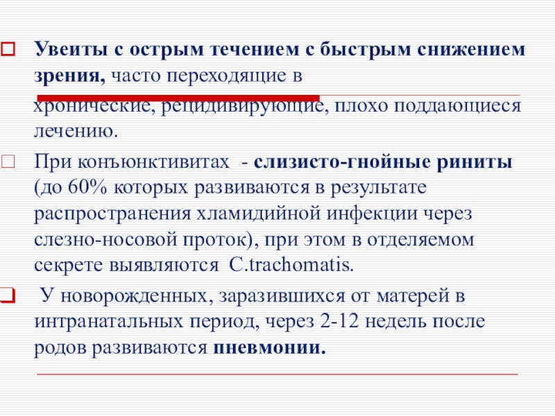 (до 60% которых развиваются в результате распространения хламидийной инфекции через слезно-носовой проток), при этом в отделяемом секрете выявляются C.trachomatis.