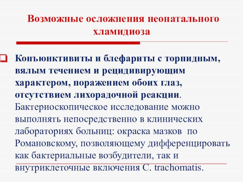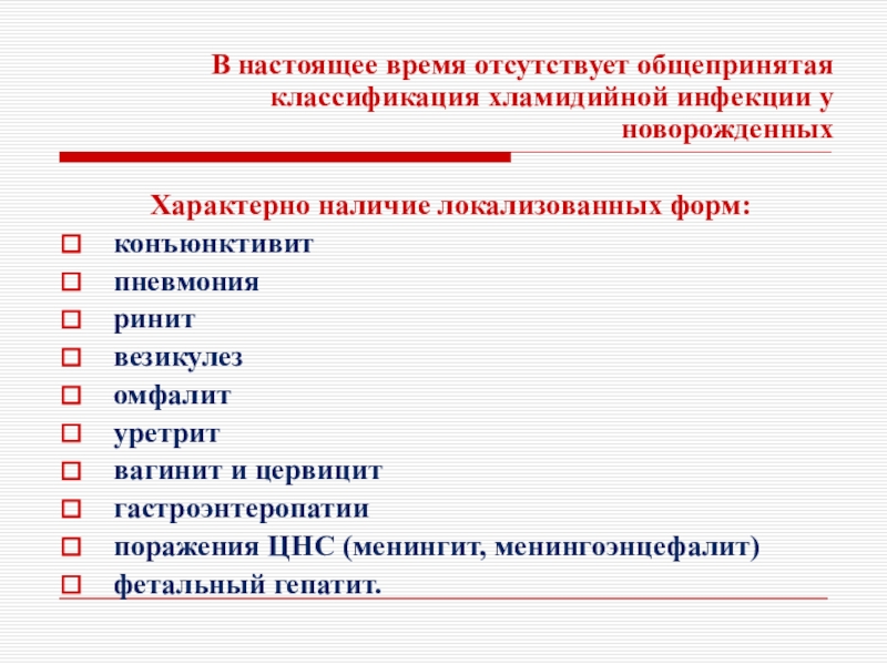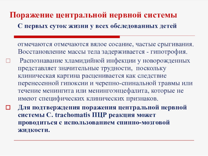 Распознавание хламидийной инфекции у новорожденных представляет значительные трудности, поскольку клиническая картина расценивается как следствие перенесенной гипоксии и черепно-спинальной травмы или течение менингита или менингоэнцефалита, которые не имеют специфических клинических признаков.