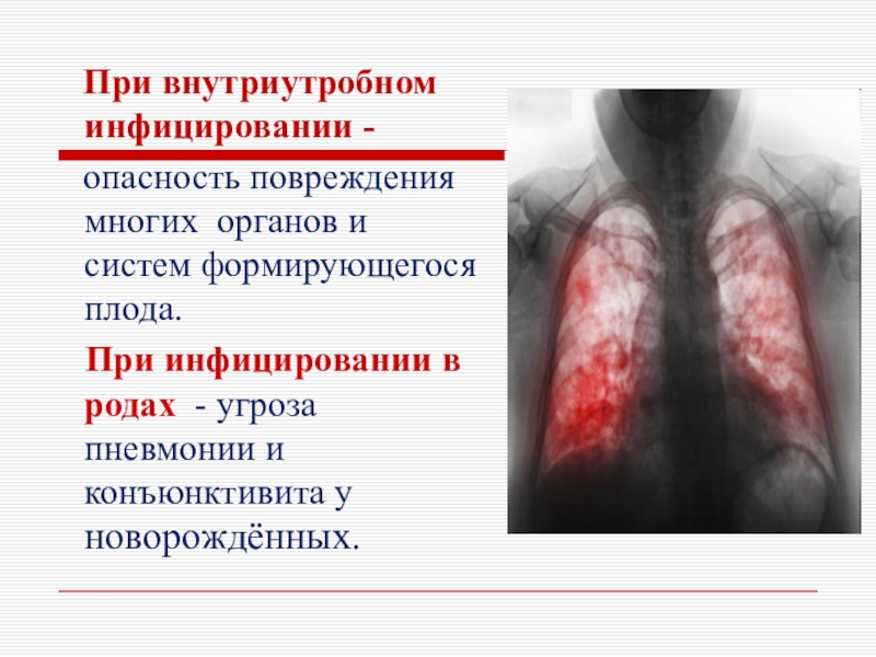 У новорожденных, заразившихся от матерей в интранатальных период, через 2-12 недель после родов развиваются пневмонии.