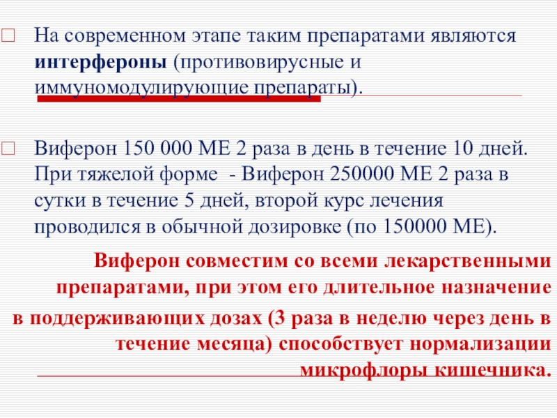 течение 10 дней. При тяжелой форме - Виферон 250000 МЕ 2 раза в сутки в течение 5 дней, второй курс лечения проводился в обычной дозировке (по 150000 МЕ).