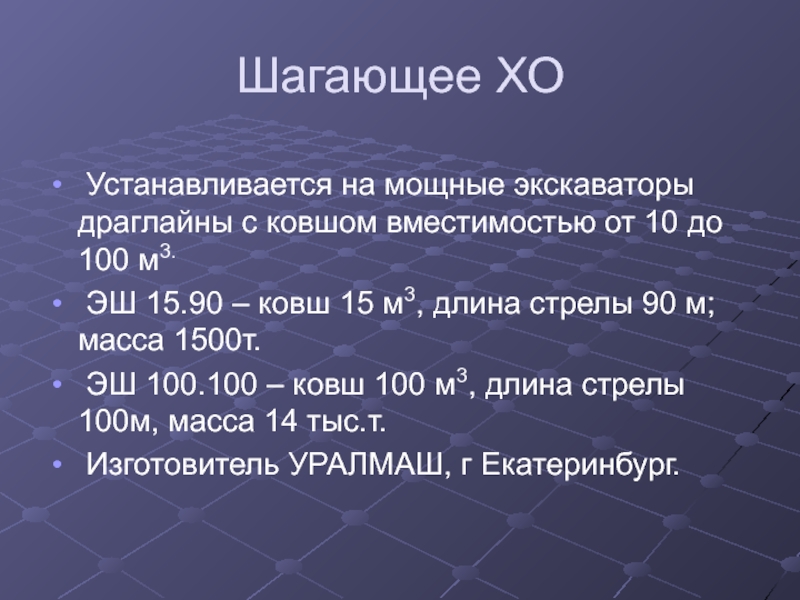 ЭШ 100.100 – ковш 100 м3, длина стрелы 100м, масса 14 тыс.т.