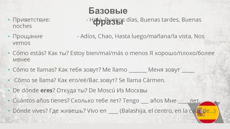 Cómo te llamas? Как тебя зовут? Me llamo _______ Меня зовут _____