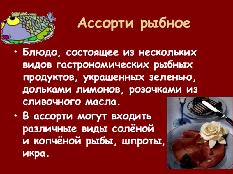 Ассорти рыбноеБлюдо, состоящее из нескольких видов гастрономических рыбных продуктов, украшенных зеленью, дольками лимонов, розочками из сливочного масла.В