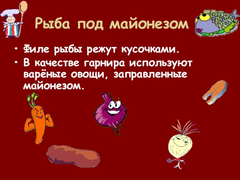 Рыба под майонезомФиле рыбы режут кусочками.В качестве гарнира используют варёные овощи, заправленные майонезом.