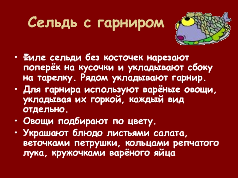 Сельдь с гарниромФиле сельди без косточек нарезают поперёк на кусочки и укладывают сбоку на тарелку. Рядом укладывают