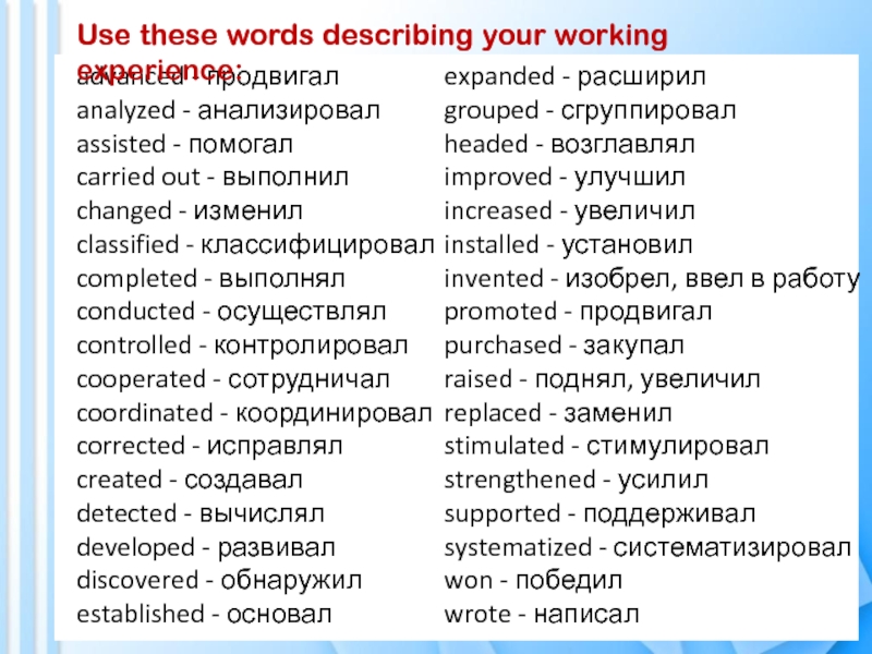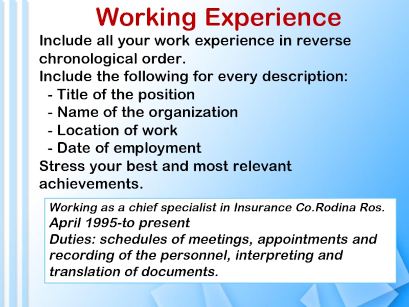 Employment (Профессиональный опыт)Positions of responsibilities (социальная активность)