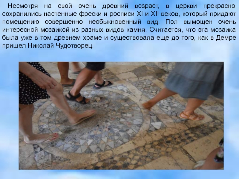 веков, который придают помещению совершенно необыкновенный вид. Пол вымощен очень интересной мозаикой из разных видов камня. Считается, что эта мозаика была уже в том древнем храме и существовала еще до того, как в Демре пришел Николай Чудотворец.