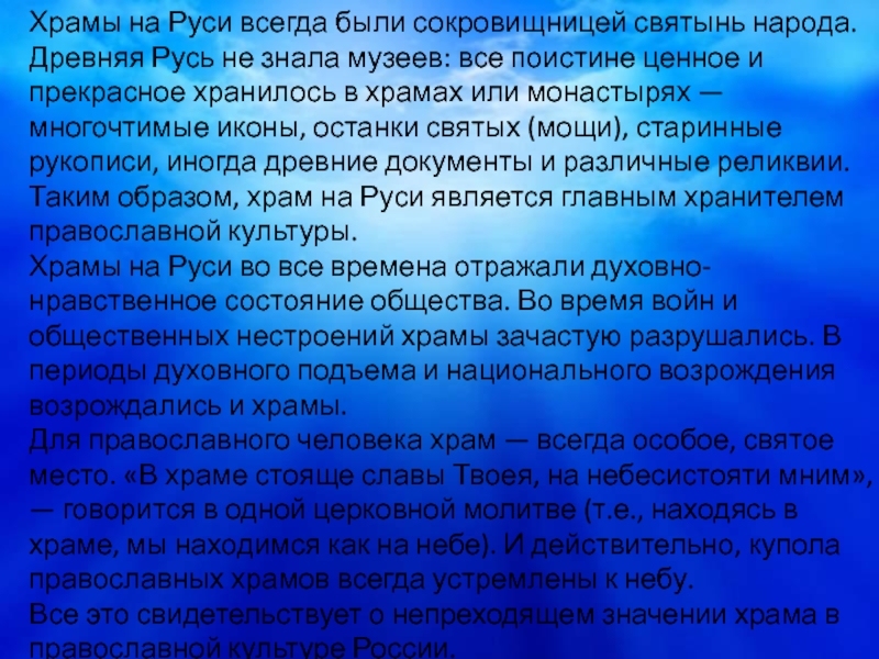 храмах или монастырях — многочтимые иконы, останки святых (мощи), старинные рукописи, иногда древние документы и различные реликвии. Таким образом, храм на Руси является главным хранителем православной культуры.
