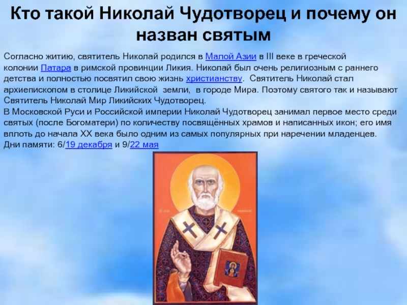 римской провинции Ликия. Николай был очень религиозным с раннего детства и полностью посвятил свою жизнь христианству. Святитель Николай стал архиепископом в столице Ликийской земли, в городе Мира. Поэтому святого так и называют Святитель Николай Мир Ликийских Чудотворец.