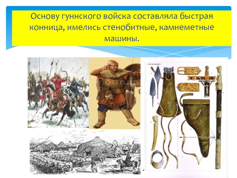 Основу гуннского войска составляла быстрая конница, имелись стенобитные, камнеметные машины.