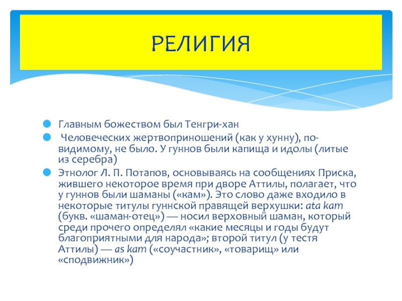 Этнолог Л. П. Потапов, основываясь на сообщениях Приска, жившего некоторое время при дворе Аттилы, полагает, что у гуннов были шаманы («кам»). Это слово даже входило в некоторые титулы гуннской правящей верхушки: ata kam (букв. «шаман-отец») — носил верховный шаман, который среди прочего определял «какие месяцы и годы будут благоприятными для народа»; второй титул (у тестя Аттилы) — as kam («соучастник», «товарищ» или «сподвижник»)