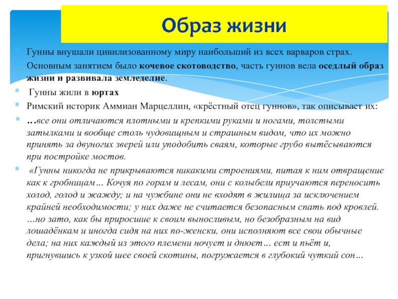 Римский историк Аммиан Марцеллин, «крёстный отец гуннов», так описывает их: