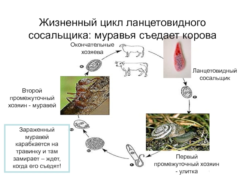 Жизненный цикл ланцетовидного сосальщика: муравья съедает корова