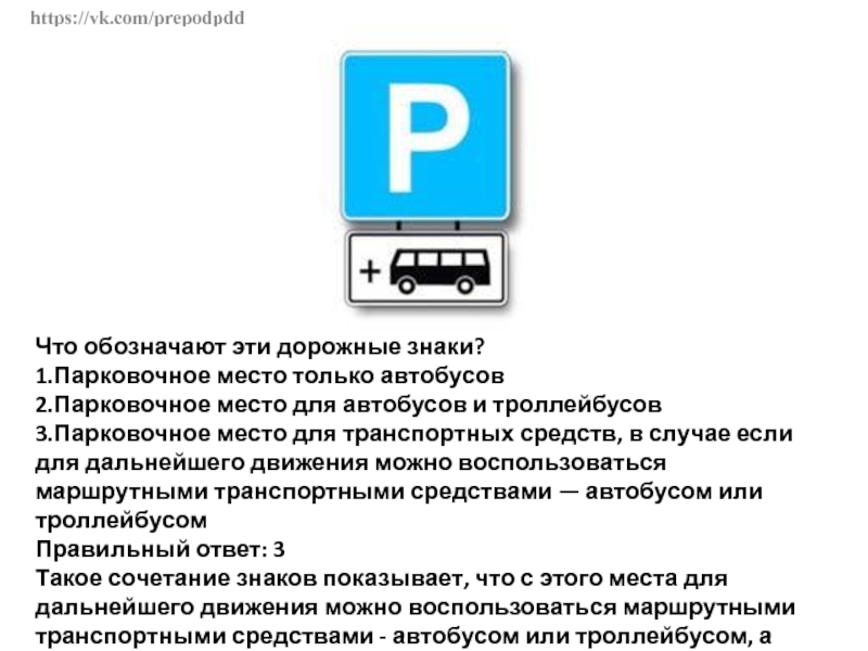 Такое сочетание знаков показывает, что с этого места для дальнейшего движения можно воспользоваться маршрутными транспортными средствами - автобусом или троллейбусом, а свой автомобиль можно оставить на оборудованной стоянке. («Дорожные знаки»»)