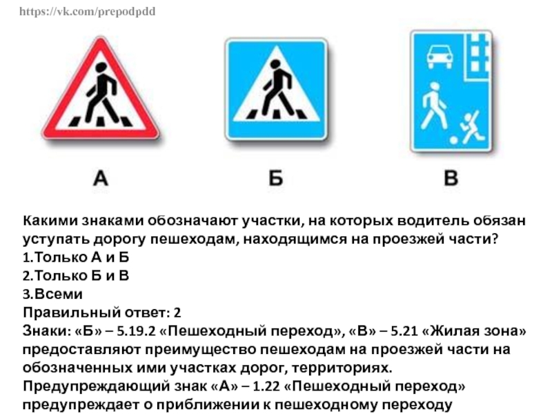 Знаки: «Б» – 5.19.2 «Пешеходный переход», «В» – 5.21 «Жилая зона» предоставляют преимущество пешеходам на проезжей части на обозначенных ими участках дорог, территориях. Предупреждающий знак «А» – 1.22 «Пешеходный переход» предупреждает о приближении к пешеходному переходу