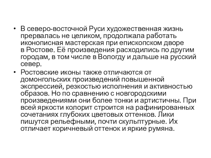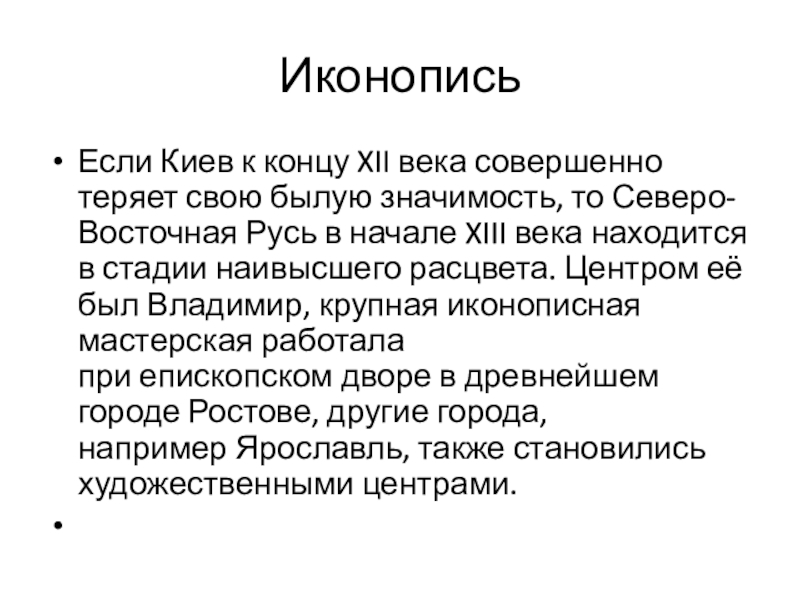 расцвета. Центром её был Владимир, крупная иконописная мастерская работала при епископском дворе в древнейшем городе Ростове, другие города, например Ярославль, также становились художественными центрами.